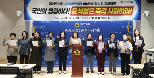 [금요저널] 경기도의회 더불어민주당 여성의원협의회, 이하 ‘민여협’)가 5일 기자회견을 갖고 윤석열 대통령의 비상계엄 선포를 규탄하고 퇴진을 촉구하는 결의문을 발표했다.