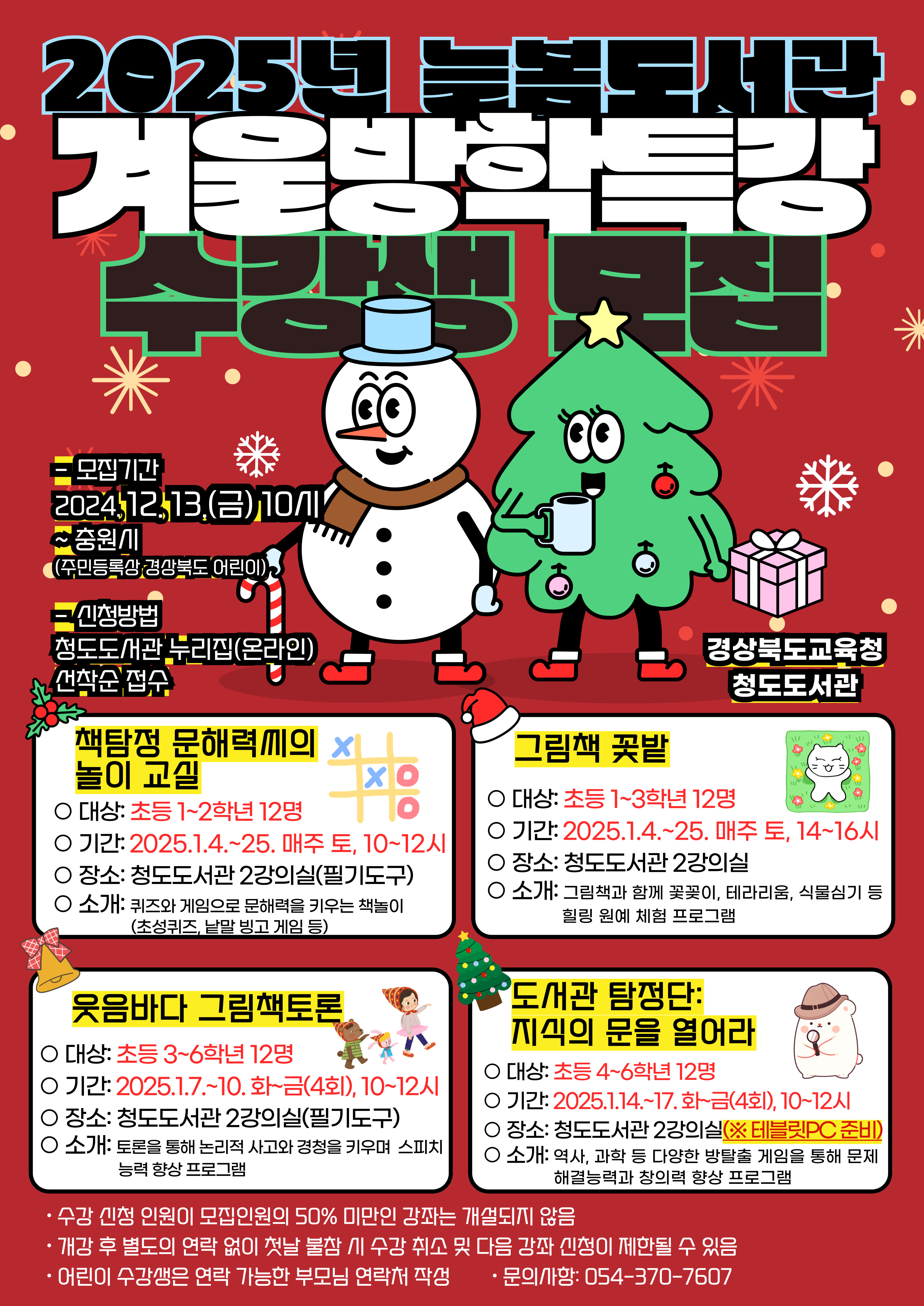 경상북도교육청 청도도서관(관장 서경희)은 겨울방학을 맞이하여 양질의 교육과 돌봄 서비스를 제공을 위한 [2025년 늘봄도서관] 겨울방학 특강 수강생을 12월 13일(금)부터 모집한다.