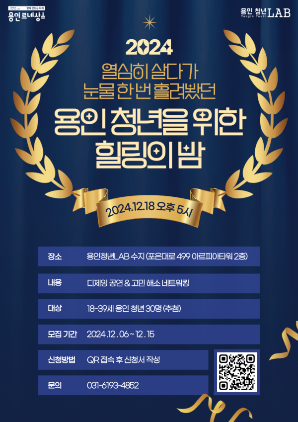 [금요저널] 용인특례시는 18일 용인청년LAB수지에서 ‘열심히 살다가 눈물 한 번 흘려봤던 용인 청년을 위한 힐링의 밤’을 진행한다고 6일 밝혔다.