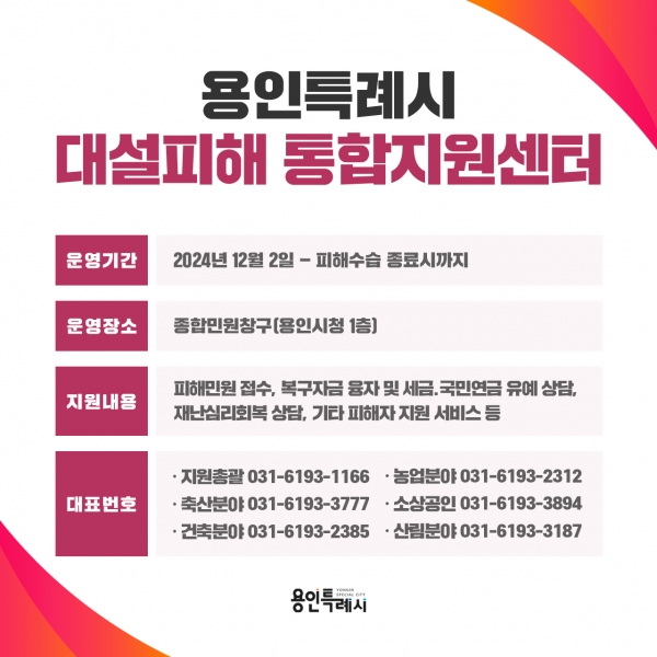 [금요저널] 용인특례시는 지난달 27~28일 내린 폭설로 피해를 입은 시민들이 편리하고 신속하게 상담을 받을 수 있도록 2일부터 통합지원센터를 운영하고 있다고 9일 밝혔다.