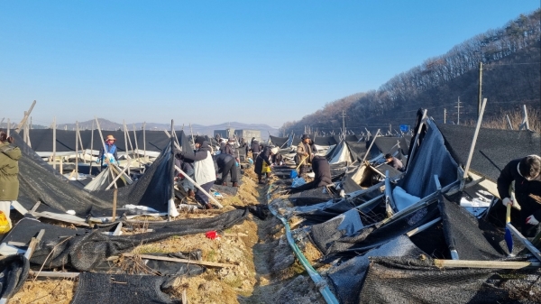 [금요저널] 이천시는 지난 11월 26~28일 117여 년만의 폭설로 이천시 전역에 걸쳐 비닐하우스시설과 인삼재배시설, 축사 등이 붕괴하거나 파손되는 등 농가에 집중적인 피해가 발생하자 공무원과 자원봉사자 등이 연일 피해복구 지원에 나서고 있다.