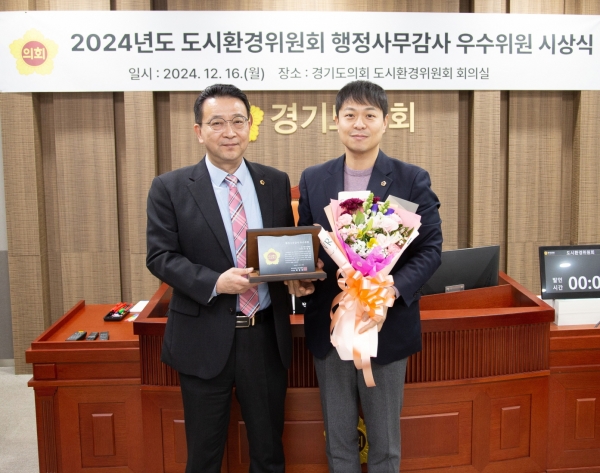 이번 수상은 지난 11월 8일부터 21일까지 14일간 진행된 도시환경위원회 소관 도시주택실, 경기주택도시공사, 기후환경에너지국, 보건환경연구원, 경기환경에너지진흥원 및 수자원본부 등에 대한 행정사무감사에서 탁월한 성과를 거둔 점이 인정받아 수상자로 선정됐다.