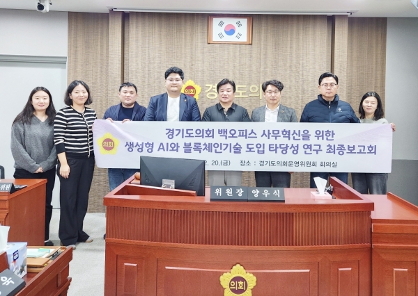[금요저널] 경기도의회 혁신추진특별위원회는 20일 의회운영위원회 회의실에서 ‘경기도의회 백오피스 사무혁신을 위한 생성형 AI와 블록체인기술 도입 타당성 연구’에 대한 정책연구용역 최종보고회를 개최했다.