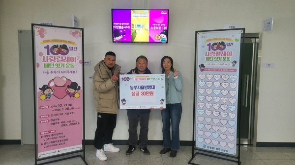 [금요저널] 의정부시 의정부1동주민센터는 12월 26일 의정부1동 동부자율방범대 회원들이 ‘100일간 사랑릴레이 배턴 잇기’에 동참해 30만원을 기부했다고 밝혔다.