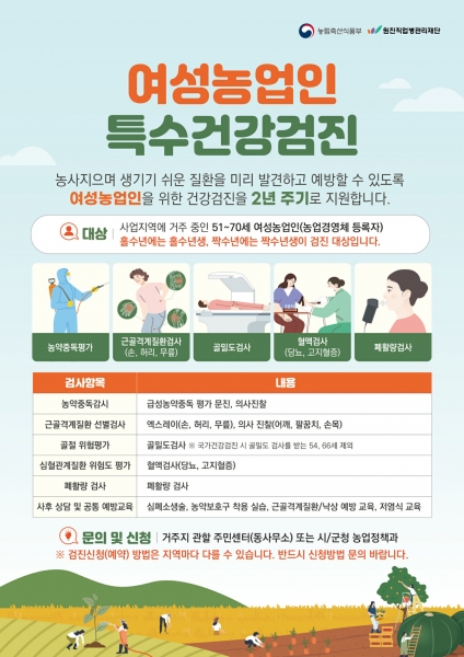 연천군은 올해 1~2월 검진대상자 모집을 통해 여성농업인 특수건강검진을 실시할 예정으로 주소지 읍·면 행정복지센터 산업팀에 신청하면 된다.