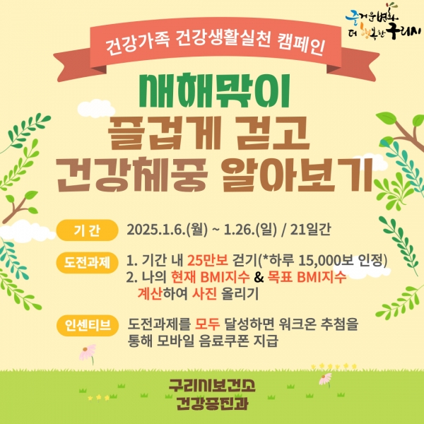 [금요저널] 구리시는 2025년 새해맞이 건강가족 건강생활실천 캠페인으로 ‘즐겁게 걷고 건강체중 알아보기 챌린지’를 운영한다고 전했다.