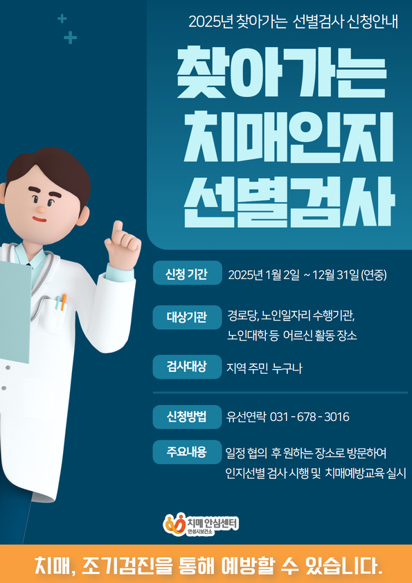 [금요저널] 안성시보건소 치매안심센터가 오는 6일부터 선제적 치매예방 및 치매환자 조기발견을 위해 ‘찾아가는 치매선별검사’를 실시한다.