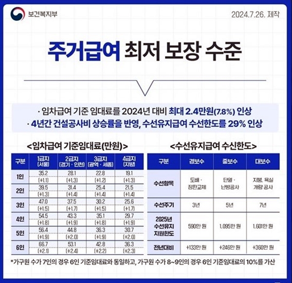 2025년 기준 중위소득이 인상됨에 따라, 주거급여 수급자 선정 기준은 △1인 가구 소득인정액 114만8천166원 △2인 가구는 188만7천676원 △3인 가구는 241만2천169원 △4인 가구는 292만6천931원으로 확대된다.