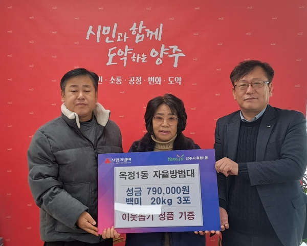 [금요저널] 양주시 옥정1동 자율방범대가 최근 관내 소외된 이웃들에게 관심과 사랑을 전달하고자 옥정1동 행정복지센터를 방문해 100만원 상당의 성금과 성품을 전달했다.