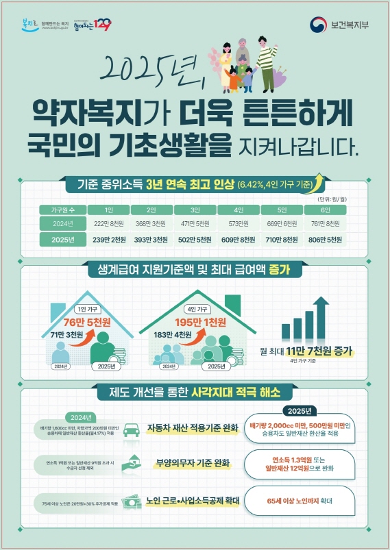 2025년 기준중위소득이 역대 최대 증가율로 확대되며 4인 가구 기준으로 지난해 572만 9,913원 대비 6.42% 인상된 609만 7,773원, 생계·의료·주거·교육급여를 포함한 전체 수급가구의 약 74%를 차지하는 1인 가구 기준은 지난해 222만 8,445원 대비 7.34% 인상된 239만 2,013원으로 늘어났다.