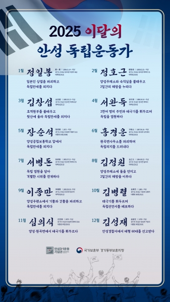 이들은 격렬한 독립운동을 전개하며 조국 독립에 헌신한 인물들로 안성3·1운동기념관은 이들의 기록을 바탕으로 매월 한 명씩 ‘2025년 이달의 안성 독립운동가’로 선정해 홍보물을 제작·배포할 예정이다.