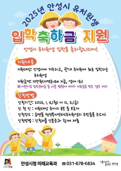 안성시에서 성장하고 있는 유아의 유치원 입학을 축하하고 학부모의 양육비 부담을 경감해 교육복지를 보편화하고 안성시의 행복한 교육환경을 실현하기 위함이다.