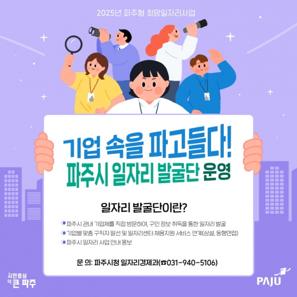 [금요저널] 파주시는 지역 내 민간 일자리 발굴 및 확대를 위해 ‘기업속을 파고들다 일자리 발굴단’에 함께할 근로자를 1월 8일부터 17일까지 모집한다.