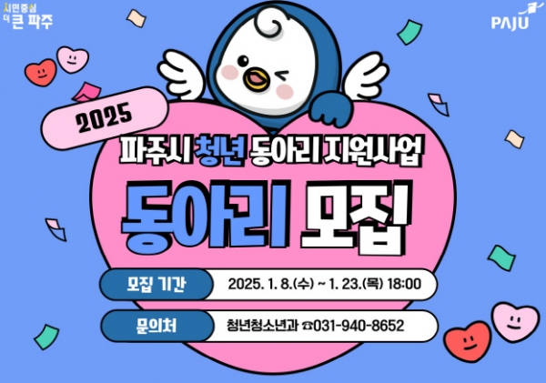[금요저널] 파주시는 지역사회 내 청년들의 연계망을 강화하고 교류를 활성화하기 위해 ’ 2025년 청년동아리 지원사업‘에 참여할 청년동아리를 오는 24일까지 모집한다.