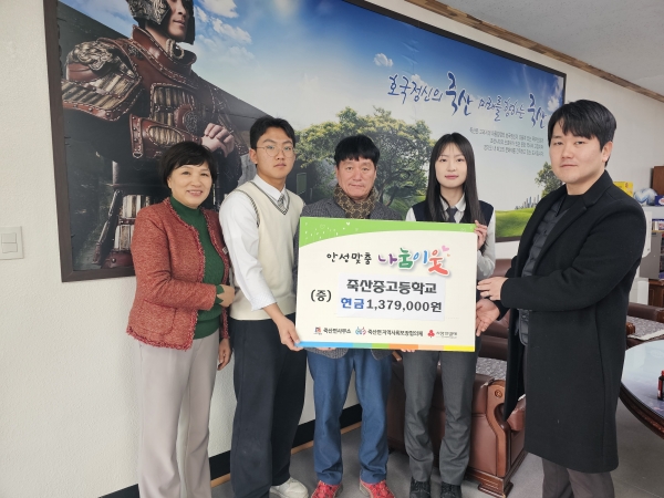 [금요저널] 죽산면사무소는 국제인증 IB 프로그램을 운영 중인 죽산중고등학교 학생회[회장 김남혁, 최현아]에서 지역사회 독거노인들을 위해 쓰일 수 있도록 기부금 1,370천원을 1월 8일 면사무소에 기탁했다고 밝혔다.