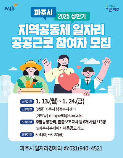 [금요저널] 파주시가 오는 24일까지 2025년 상반기 지역공동체일자리 및 공공근로사업 참여자 13명을 모집한다.