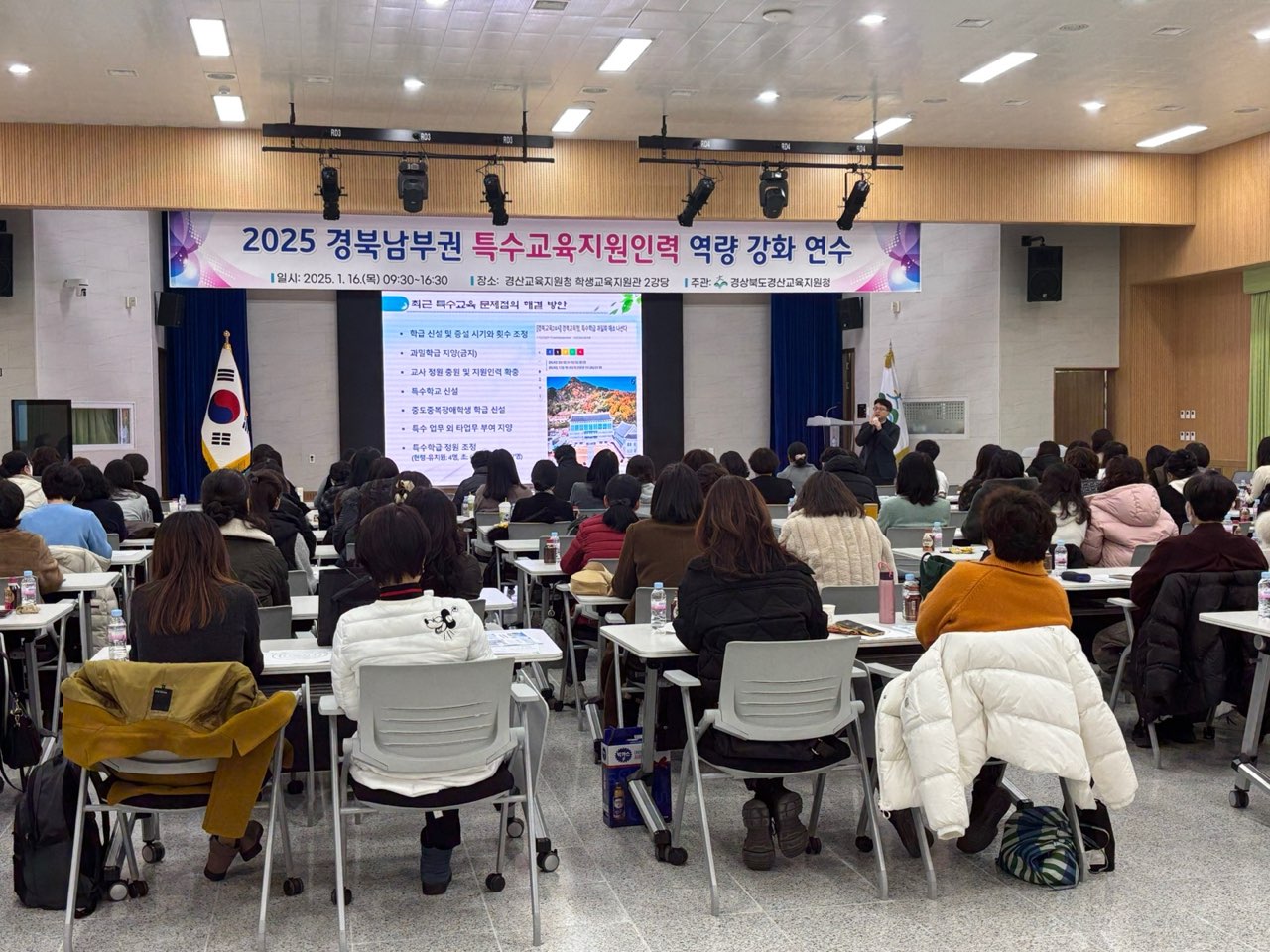 □ 경산교육지원청(교육장 박경화) 특수교육지원센터는 1월 16일(목) 학생교육지원관 2강당에서 경북 남부권(경산, 영천, 청도, 경주) 유, 초, 중, 고, 특수학교 특수교육실무사 및 사회복무요원 120여명을 대상으로 역량 강화 연수를 실시하였다.