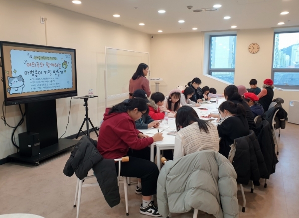 ‘새해 소망을 담은 마법종이 키링 만들기’라는 주제로 열을 가하면 수축하며 플라스틱이 되는 특수종이를 활용해 키링을 만드는 등 신기하고 재미있는 광경에 아이들의 큰 호응을 얻었다.