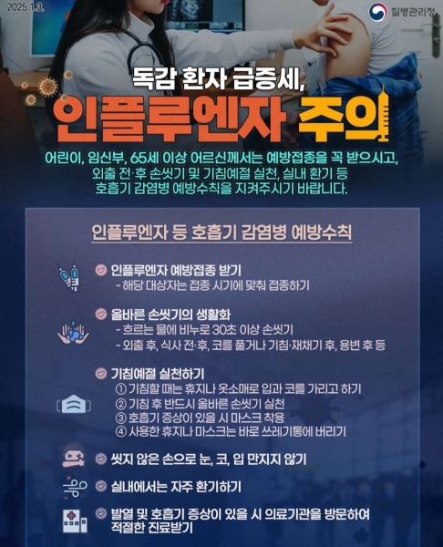 세계보건기구에서 권고한 인플루엔자 백신 생산에 사용된 바이러스 24-25절기 인플루엔자 국가예방접종은 인플루엔자 감염 시 중증화 위험이 큰 6개월~13세 어린이, 임신부, 65세 이상 어르신을 대상으로 올해 4월 30일까지 전국 위탁의료기관에서 무료 접종이 가능하다.