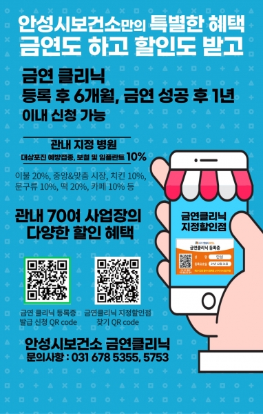 이용 방법은 안성시보건소 홈페이지에서 '금연클리닉 등록증'을 신청하면 모바일로 발급받을 수 있으며 병원, 식당, 의류점, 학원 등 다양한 생활 밀착 업종에서 10~50%의 할인 혜택을 제공한다.
