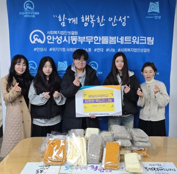 [금요저널] 안성시동부무한돌봄네트워크팀은 지난 17일 베일러국제학교 학생들이 취약계층 어르신을 위해 직접 만든 목도리 25개를 전달받았다고 밝혔다.