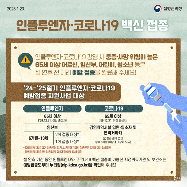 노인, 임신부, 어린이, 청소년 등 중증 위험군은 설 연휴 전에 예방접종을 완료할 것을 권고한다.