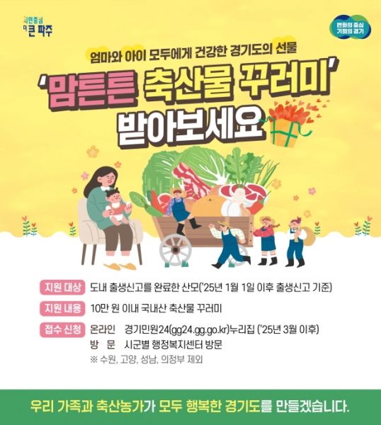 맘튼튼 축산물꾸러미 지원 사업은 2025년 파주시에서 출생신고를 마친 산모들에게 10만원 상당의 지역 축산물꾸러미를 지원해 출산으로 인한 산모의 영양 불균형을 해소하고자 시행되는 사업이다.
