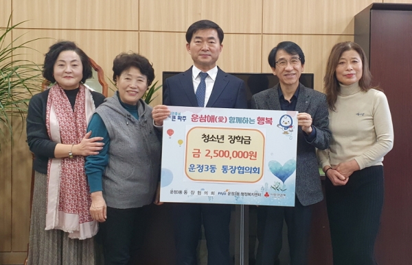 [금요저널] 파주시 운정3동 통장협의회는 품행이 단정하고 학업성적이 우수한 관내 학생 5명을 선발해 장학증서와 장학금을 전달했다.