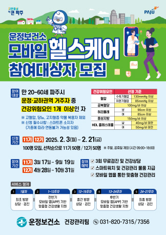 [금요저널] 파주 운정보건소가 2025년 ‘모바일 헬스케어’ 사업의 11기와 12기 참여자를 각 50명씩 선착순으로 모집한다.