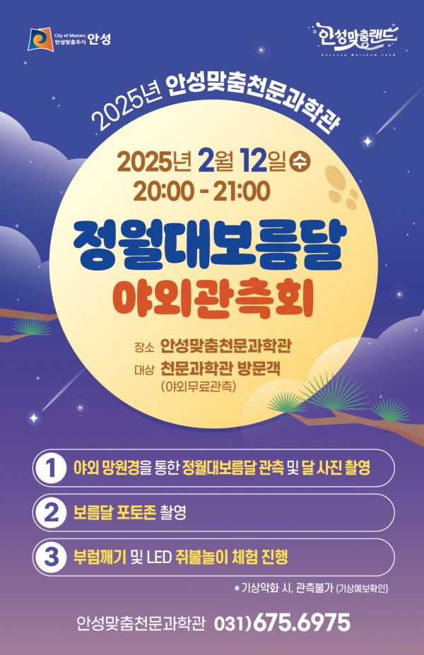 [금요저널] 안성시는 안성맞춤랜드 내 천문과학관에서 오는 2월 12일 20시~오후 9시에 2025년 을사년 푸른 뱀의 해의 정월대보름 달맞이 관측회를 개최한다고 밝혔다.
