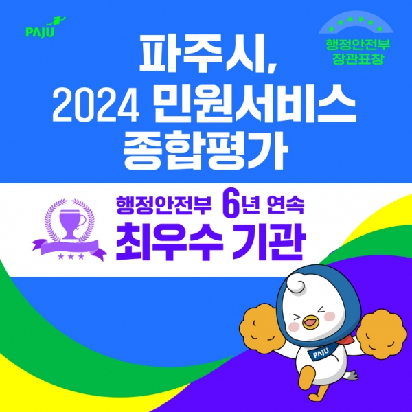 [금요저널] 파주시는 행정안전부가 국민권익위원회와 함께 실시한 ‘2024년 민원서비스 종합평가’에서 6년 연속 최우수기관으로 선정됐다.