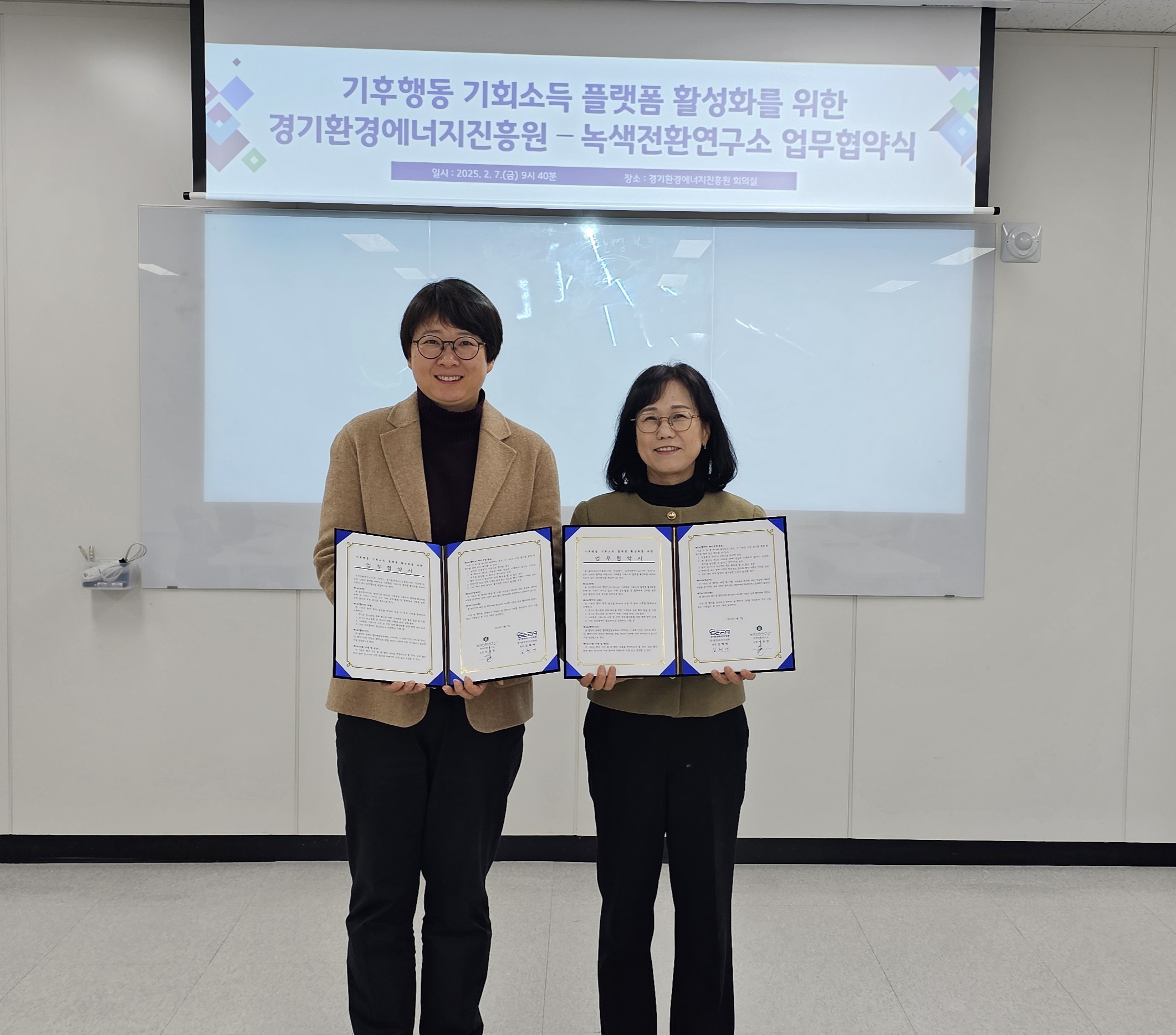 경기환경에너지진흥원(원장 김혜애)과 녹색전환연구소(소장 이유진)은 7일, ‘기후행동 기회소득 플랫폼 활성화를 위한 상호협력 업무협약(MOU)’을 체결했다.