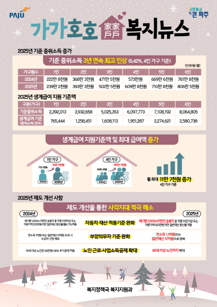 권예자 복지지원과장은 “시민들이 새롭게 변화한 복지환경에서도 복지 지원 제도를 활용할 수 있도록 완화되고 달라진 지원 기준에 대해 적극 홍보하겠다”며 “파주시는 복지서비스의 향상과 시민 체감도 개선에 노력을 집중할 것”이라고 말했다.