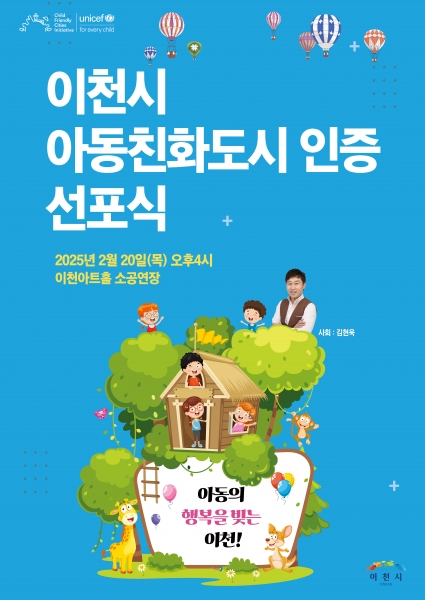 [금요저널] 이천시는 오는 2월 20일 이천아트홀 소공연장에서 유니세프 아동친화도시 인증을 기념하고 아동이 행복한 도시 조성을 위한 비전을 공유하기 위해 ‘아동친화도시 인증 선포식’을 개최한다고 밝혔다.