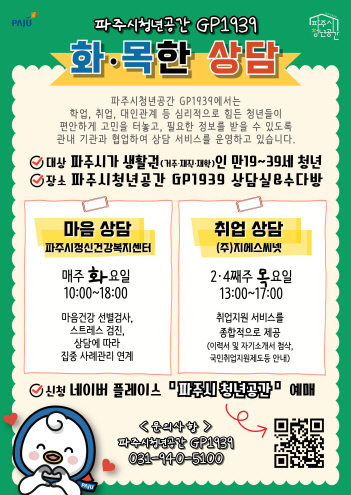 ‘화·목한 상담’은 파주시가 생활권인 청년 만 19~39세를 대상으로 △마음상담 △취업상담을 지원하는 것으로 각각 매주 화요일과 둘째, 넷째 주 목요일에 진행된다.
