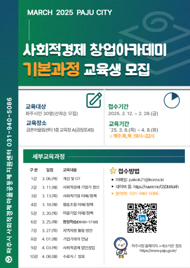 [금요저널] 파주시는 ‘2025년 사회적경제 창업아카데미’ 교육생 30명을 2월 28일까지 선착순으로 모집한다.