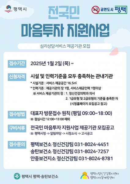 [금요저널] 평택시는 지난해 7월부터 시작된 ‘전국민 마음투자 지원사업’ 만족도 조사 결과를 공개하며 새로운 전문 심리상담센터 모집을 한다고 밝혔다.
