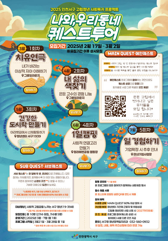 [금요저널] 인천 서구는 사회적 고립 청년을 대상으로 ‘고립청년 사회복귀 프로젝트- 나와, 우리동네 퀘스트 투어’를 추진할 계획이라고 14일 밝혔다.