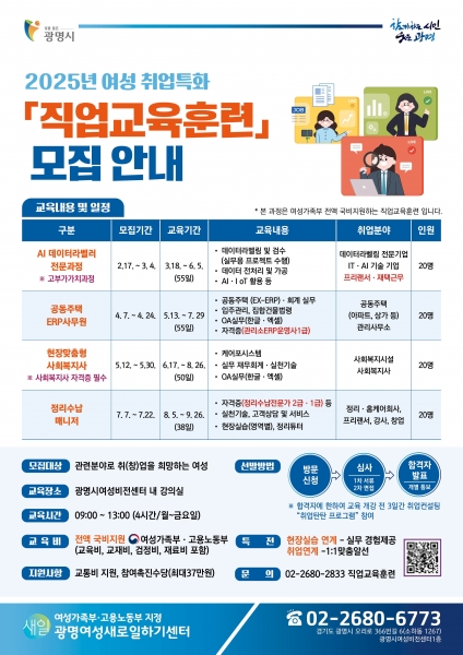[금요저널] 광명시 광명여성새로일하기센터는 여성의 성공적인 재취업을 돕기 위해 ‘2025년 여성 맞춤형 직업교육훈련’을 운영한다고 14일 밝혔다.