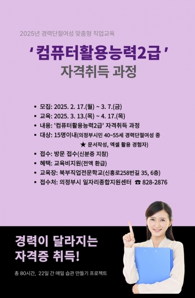 [금요저널] 의정부시는 경력단절여성을 위한 맞춤형 직업교육 프로그램 ‘컴퓨터활용능력2급 자격취득 과정’의 참여자를 모집한다.