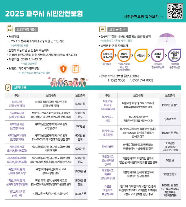 김경일 파주시장은 “재난 및 안전사고가 다각화되면서 파주시민들에 그에 따른 현실적인 지원을 위해 시민안전보험 보장항목을 지속적으로 정비하고 있다”며 “파주시민이 우선인 시민 중심 더 안전한 파주시를 만들기 위해 24시간 365일 최선을 다하겠다”고 말했다.