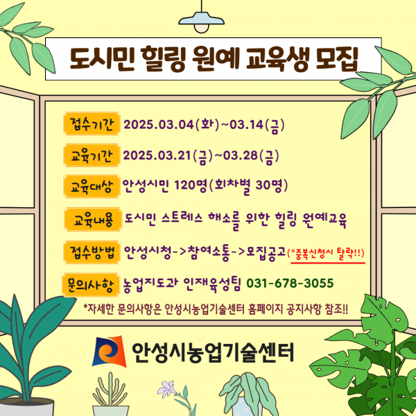 [금요저널] 안성시농업기술센터는 오는 3월 4일부터 14일까지 도시민을 대상으로 힐링 원예 교육생을 모집한다고 밝혔다.