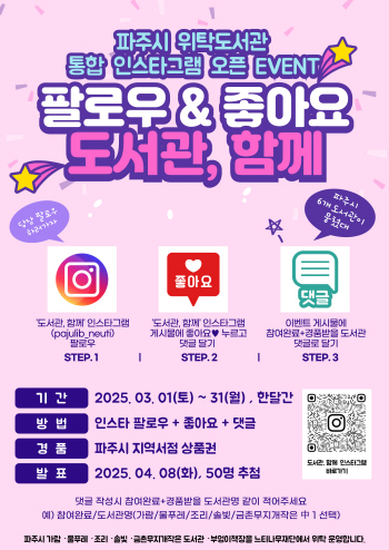 [금요저널] 파주시 위탁도서관이 누리소통망 인스타그램 채널을 개설해 3월 1일부터 31일까지 한 달간 개설 기념행사인 ‘도서관, 함께’를 진행한다고 밝혔다.