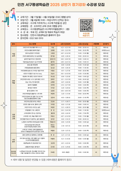 인천 서구평생학습관, 저녁 9시까지 연장 운영 “수강신청 4일부터”