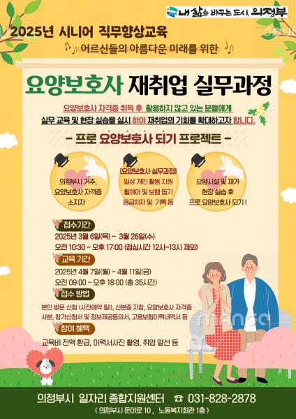 의정부시에 주소를 둔 요양보호사 자격증 소지자 15명을 선발하며 교육을 수료한 참여자에게는 훈련비 전액 환급과 이력서 사진 촬영, 맞춤형 취업 알선 등 지속적인 취업 서비스를 지원한다.