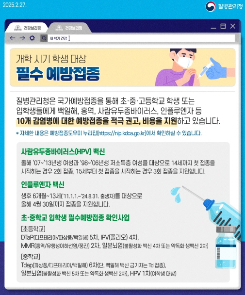 질병관리청은 국가예방접종 사업을 통해 인플루엔자, 백일해, 홍역, 인체유두종바이러스 등 10종의 감염병 예방접종을 지원한다.