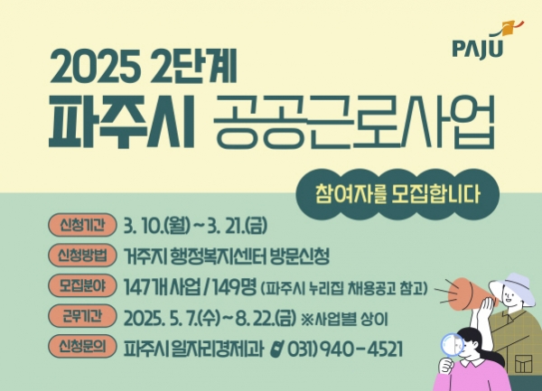 [금요저널] 파주시가 오는 21일까지 2025년 2단계 공공근로사업에 참여할 시민을 모집한다.