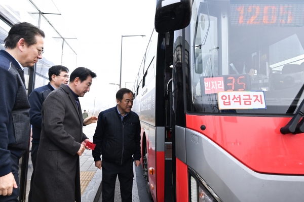 이날 김 시장은 정음마을 고산2단지 정류소에서 버스를 기다리는 승객들과 대화를 나누고 승차 후에도 시민들의 불편 사항을 청취했다.