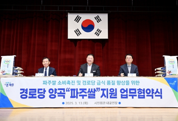 [금요저널] 파주시는 3월 13일 파주시민회관 대공연장에서 경로당의 급식 품질 향상과 파주쌀의 소비 촉진을 위한 ‘경로당 양곡 파주쌀 지원 업무협약’을 체결했다.