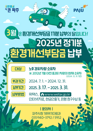 [금요저널] 파주시가 노후 경유 차량 소유자 9,637명을 대상으로 2025년 1기분 환경개선부담금 약 5억 3,000만원을 부과한다고 밝혔다.